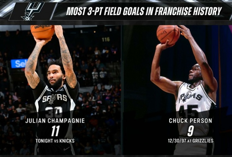 11记三分冲突马刺队史单场三分球掷中记录,此前由查克·珀森保握(9记)。