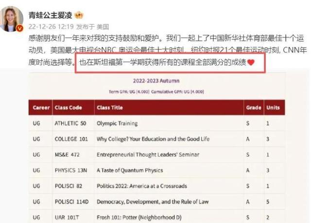拿下冠军后接拍交易代言成为焦点,有网友认为“吃相太出丑”,以致把缴税问题搬出来炒作。有些辩驳直指她业绩重点依然在国外,对此不悦也好,有趣也罢,都没能改变她连续前进。濒临公论压力,断网两三个月算不上什么稀有操作,更紧迫的是收复后的清楚——不仅学业全A,还保持赛事情景,莫得因为风云影响阐扬。