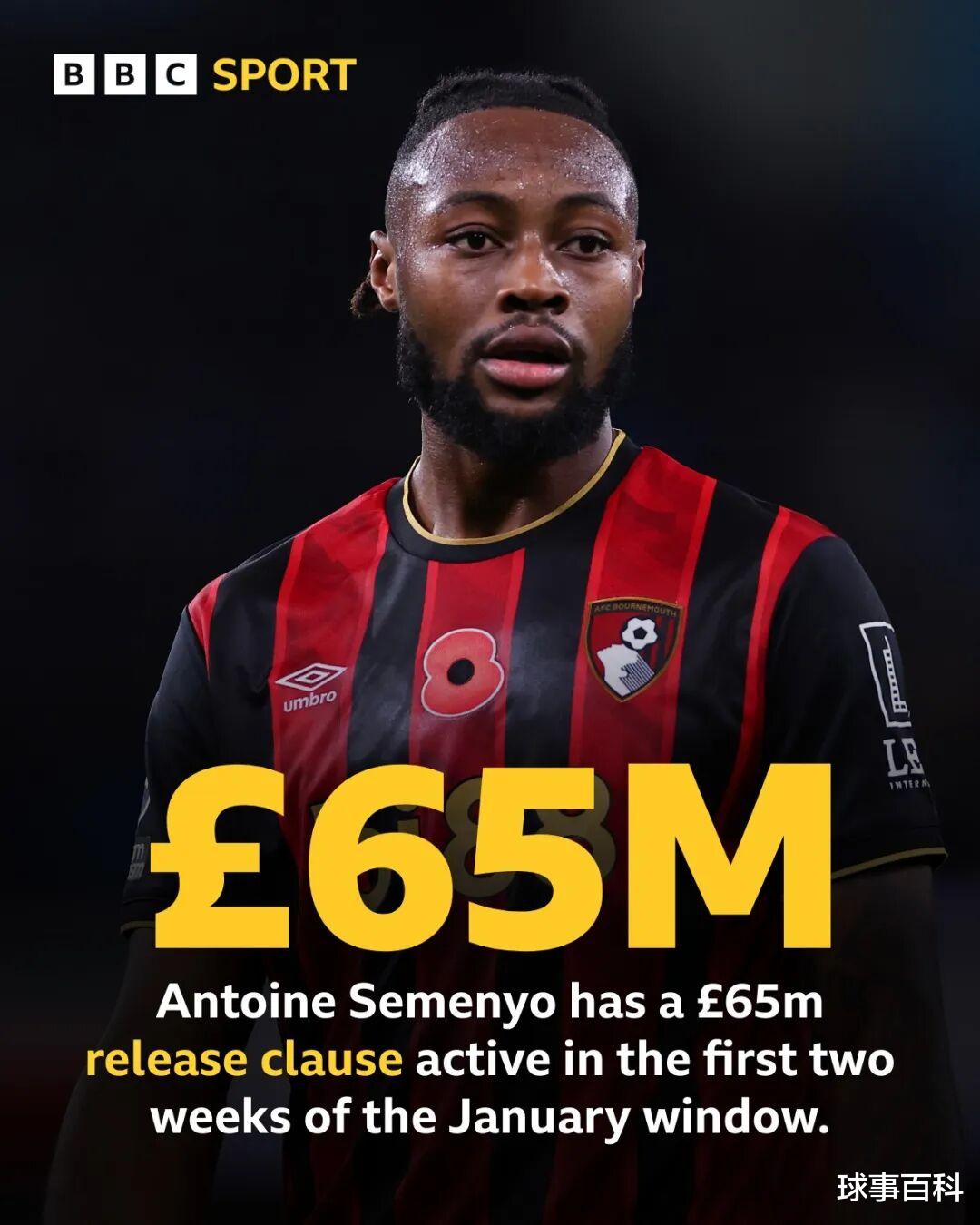 伯恩茅斯当红球星塞梅尼奥如故成为2026年转会市集上的热点东说念主物之一,而且他很可能就在一月窗口离队。据悉,他与伯恩茅斯公约中的6500万英镑解约要求将在“将来几周”负责奏效。该要求并非衔接通盘一月,而只在窗口初期一霎怒放,以约略伯恩茅斯有技术寻找替代决策。