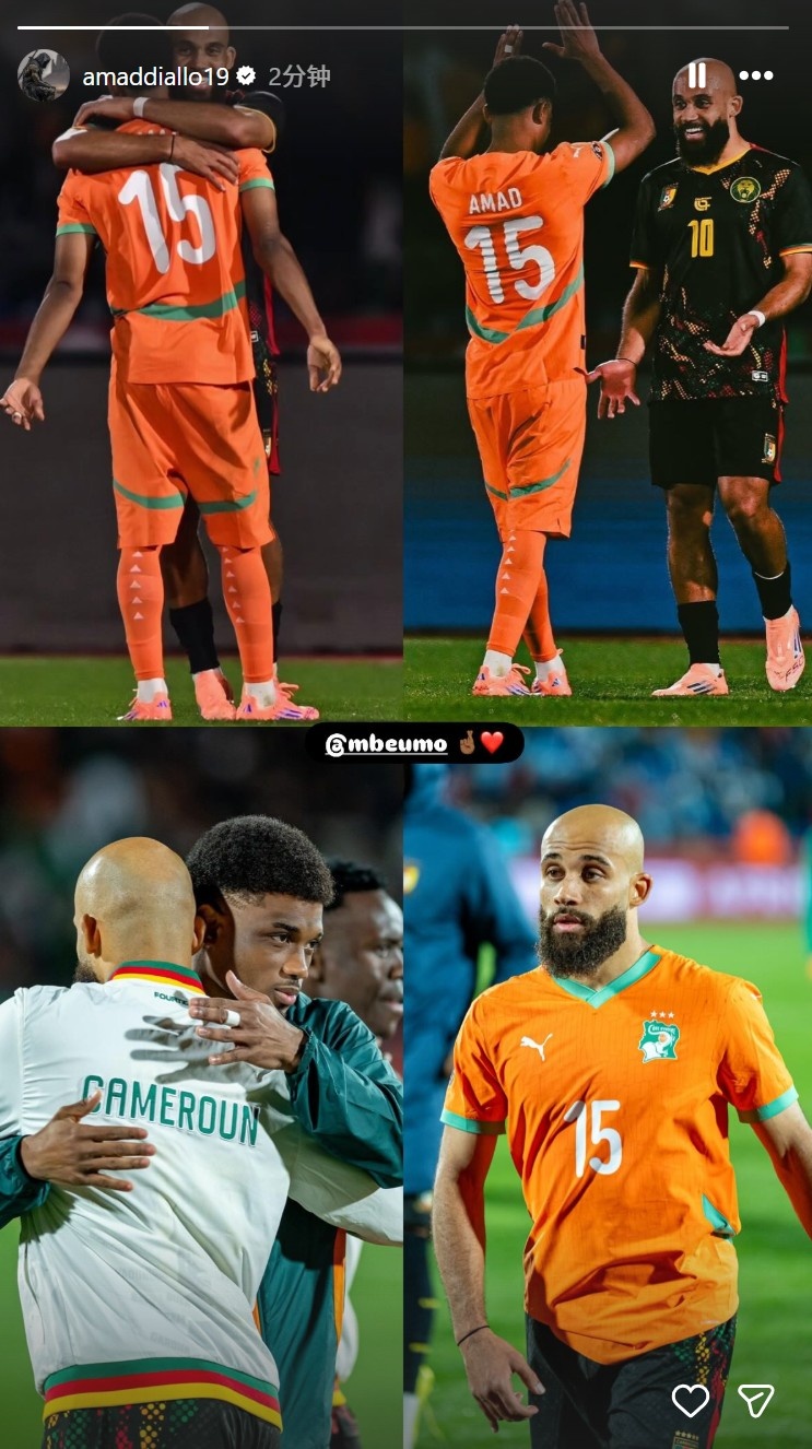 阿玛德说:“姆伯莫是个很好的队友,亦然个很棒的东说念主。咱们在赛前聊过,何况说好了比赛鸿沟后要交换球衣。我但愿他和喀麦隆队一切顺利。但当今我只思专注于我方和我的球队,并起劲获取下一场比赛。