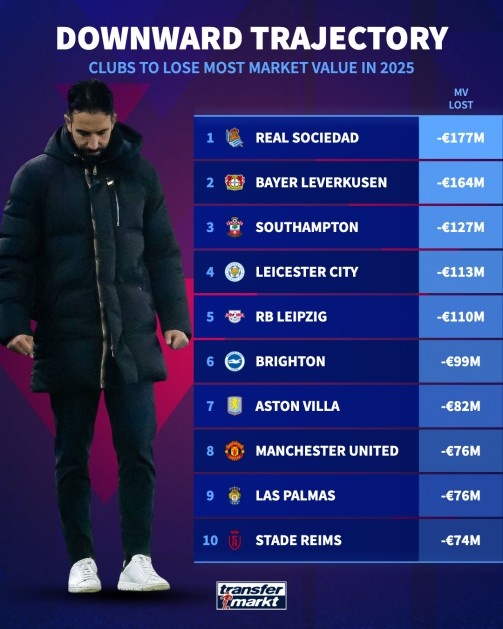 12月30日讯 2025年行将终止,德国转会阛阓清点了这一年俱乐部身价下降情况,皇家社会下降1.77亿欧居首,曼联下降7600万欧第8。