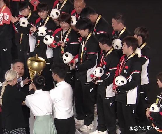 2025年混团天下杯,国乒在樊振东、陈梦等主力缺席的情况下,由王楚钦、孙颖莎、蒯曼等新锐担纲,也曾以全胜战绩闭幕三连冠。受奖礼上,王励勤算作新任乒协主席为队员奉上吉利物。 而刘国梁的出现,则带来了另一种泄露感。 有网友留言:“他一来,敌对就对了。 ”