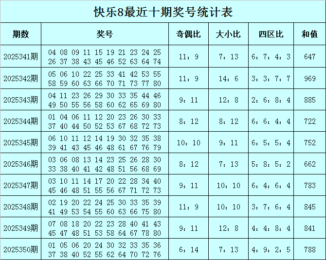 福彩惬心8第2025350期开奖追念:01 05 06 20 24 30 32 33 35 36 37 38 40 52 55 62 64 70 72 76,其中奖号四区比为4:9:2:5,奇偶比比为6:14,大小比为7:13,和值为788。